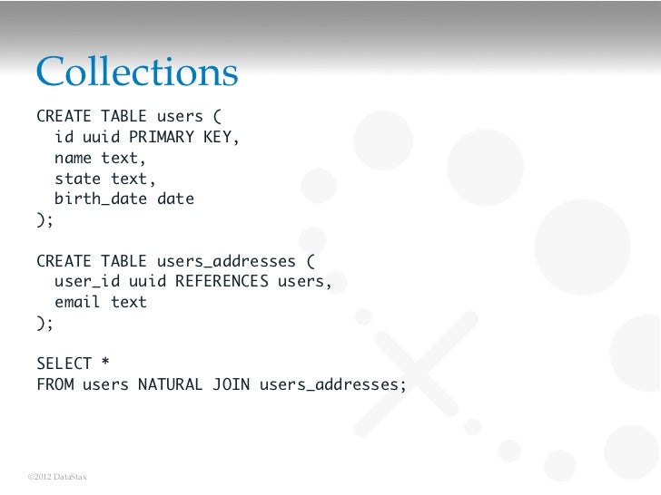 Update with cassandra cql. ask question. up vote 1 down vote favorite. i'm new to cassandra and i'm trying to update a table using this cql query: you have to pass all primary key when you want to update column . so put all primary keys in where clause . share | improve this answer. answered aug 17 '15 at 5:29. mahendra singh. 28 2.. In cassandra , the difference between primary key,partition key,composite key, clustering key always makes some confusion.. so i am going to explain below and co relate to each others. we use cql (cassandra query language) for cassandra database access.. Primary key columns in cassandra, two types of columns have a special role: the partition key columns and the clustering columns. together, they will define your row primary key. the partition key columns are the first part of primary key and their role is to spread data evenly around the cluster..